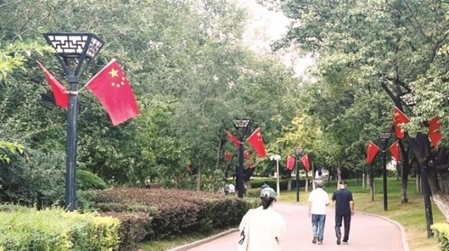 27日,市人民公园里挂起了五星红旗,营造了浓浓的节日氛围。据了解,我市以“中国红”与“鲜花艳”为主色调,通过悬挂国旗、布置花卉景观等多项举措,将城区主干道、广场及公园装点一新,喜迎国庆、中秋。