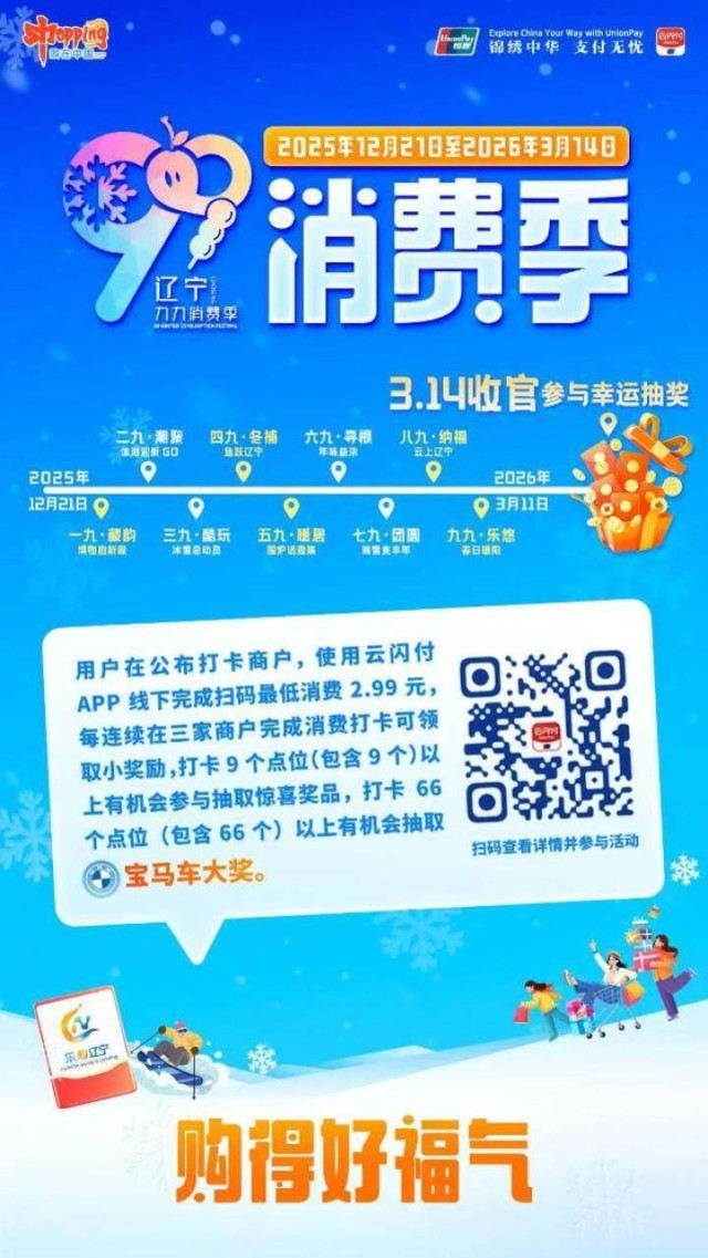 此外,2025年12月21日至2026年3月14日,市民通过云闪付线下消费满2.99元即可打卡,连续3家打卡领小奖,9个及以上点位可抽惊喜奖品,66个及以上点位有机会赢宝马车大奖。鞍山7大打卡点紧扣“9”系主题,深度融合地域特色,让市民游客在打卡消费中感受钢都冬日独特魅力,为这个冬天注入消费活力。